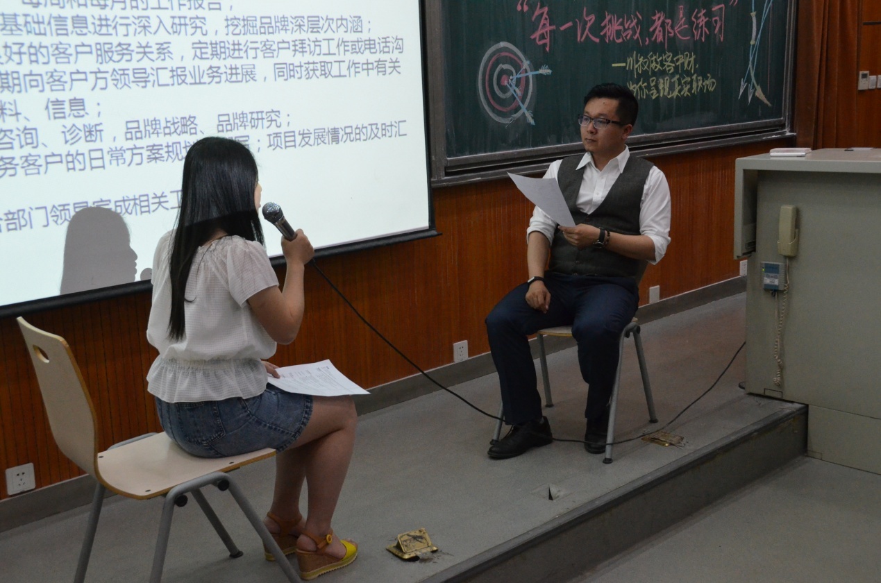 小川叔用他温柔又不失犀利的话语向同学们讲述了他自己在十年职场打拼期间更换七次工作的经历与经验,其中包括他在动漫行业从热情到退出、在文字方面从坚持到转行、在地产方面从陌生到提升的经历,小川叔在各个领域的转变,都令他得到最真实而深刻的感悟。真实的经历也很快让同学们感受到职场的真实与残酷。之后他又为正处于迷茫期的同学们提供了宝贵意见来认识自我,让同学们开始认真思考自己今后的职业发展。期间,小川叔还进行了现场模拟面试环节,对有意愿进行实习的学生进行了面试,并给表现优秀的同学提供了知名企业的实习机会。面试环节之后小川叔更是针对面试的同学的表现给在场同学们耐心讲解了面试的技巧,让同学们受益匪浅。