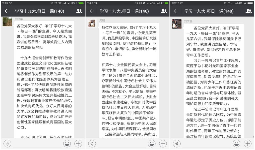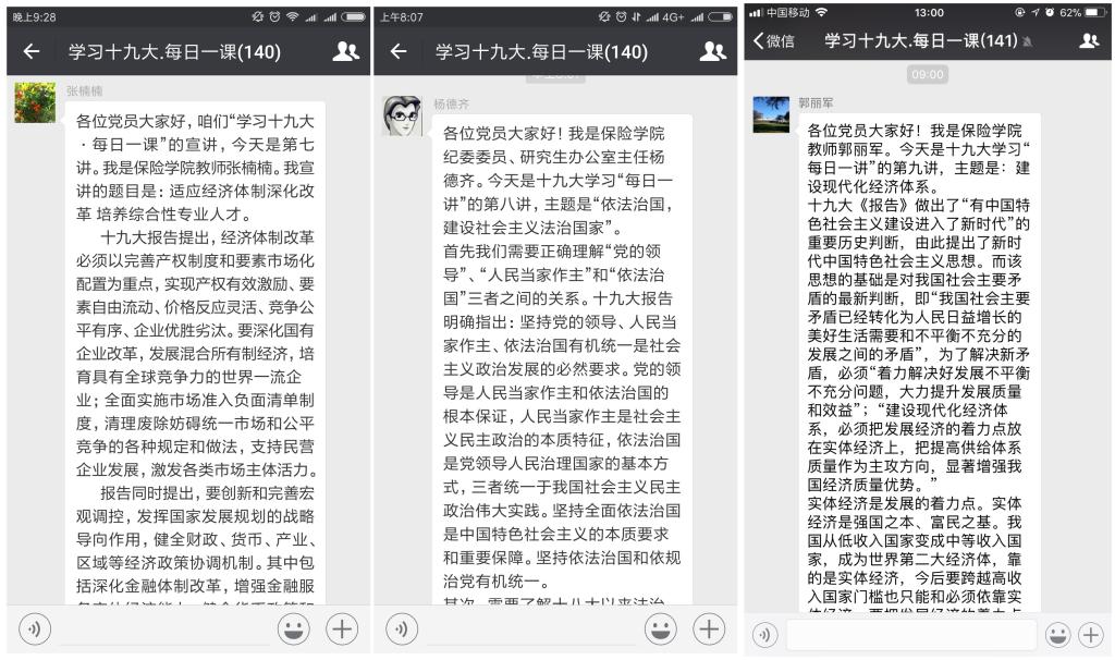 在宣讲的同时,群里的党员们也对宣讲内容深入思考,积极踊跃地发表自己的学习感想,在微信群里进行分享和讨论交流。其中,王圆圆在发言中说,党的十九大报告不仅着眼全局,分析了未来我国发展的总路径,还从社会民生角度提出了更多贴近群众的发展愿景。让大家感觉到国家在将目光更多地投向了“以人为本”的方面,让发展成为了关系到每个人生活的事情,提升了大家在国家发展中的参与感,真正体现了国家的中国梦是每个人中国梦的集合。师生党员们纷纷在群里表示赞同并表达了对中国梦的看法。紧接着,褚福灵老师在群里分享了有关“如何在发展中保障和改善民生,不断建立健全社会保障体系”的想法,他认为不仅要在幼有所育、学有所教、劳有所得、病有所医、老有所养、住有所居、弱有所扶上取得新进展,还应当在灾有所援、贫有所帮、冤有所诉等方面取得新进展,建立起基于“十有”得大社会保障体系。发表想法后,党员们表示赞同也有人表示疑惑,比如,苏泽瑞针对褚福灵老师提出的“十有”的大社会保障体系概念,在群里向褚福灵老师提问“当前建设社会保障体系的主要任务是什么”。褚福灵回答说应当按照“人人尽责、人人享有、坚守底线、完善制度、突出重点、引导预期”的指导思想,通过加强立法、健全管理、规范技术等举措,建立健全民生保障安全网。微信群中的讨论十分积极热烈,针对各类问题大家纷纷深入探讨,收益颇丰。
