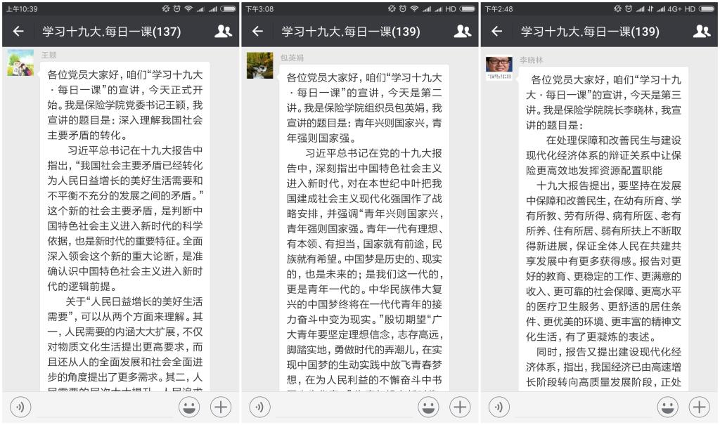 11月13日,由伟德betvlctor体育官网党委书记王颖开始第一次宣讲,她围绕主题“深入理解我国社会主要矛盾的转化”,从习近平总书记党的十九大报告出发,深入浅出地诠释了我国社会的主要矛盾。最后还提醒各位师生党员注意党的十九大报告中的新表述的关键词,宣讲内容丰富而精彩,微信群成员反响热烈,师生党员们积极发表自己听完宣讲后的感悟。第二场和第三场分别由伟德betvlctor体育官网组织员包英娟和伟德betvlctor体育官网院长李晓林进行宣讲,虽然他们同样是对党的十九大进行解读,但关注了不同的方面,从而带领大家从不同角度出发去学习习近平总书记党的十九大报告。宣讲后,师生党员们对党的十九大的认识更加全面也更进了一层。包英娟讲了“青年兴则国家兴,青年强则国家强”这一主题,在宣讲中,她深入剖析了习近平总书记党的十九大报告,希望青年能学习党的十九大报告,牢固树立理想信念,志存高远,脚踏实地,学好本领,勇担责任,勤于实践,善于开拓,争当先锋,把个人奋斗融入祖国前途命运和民族复兴伟大梦想。而李晓林院长则从保险角度出发,结合党的十九大报告,指出保险保障应当为幼、学、劳、病、老、住、弱七项事业发力,并在服务七项事业中发展自己,核心就是处理好七项事业与发展方式、经济结构、增长动力之间的辩证关系,以更高的效率发挥保险的资源配置职能。