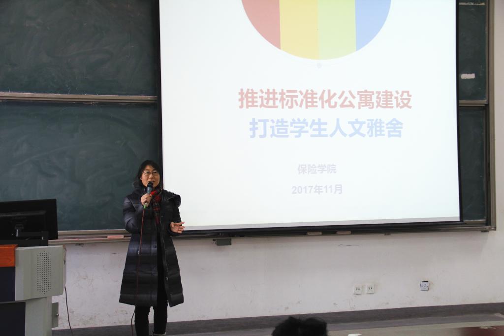 培训会伊始,才立琴老师向全体学生强调了宿舍建设的重要性,指出打造人文雅舍的意义与影响。随后由袁嘉琳老师为大家讲述了有关标准化公寓建设的条例,配合着生动形象的宿舍实景,从八个不同的方面提出了宿舍检查的要求,同时强调了宿舍纪律问题。接着,她举例说明了宿舍内存在的火灾问题,并介绍了“如何预防火灾之校园五不该”,提醒学生防患于未然。