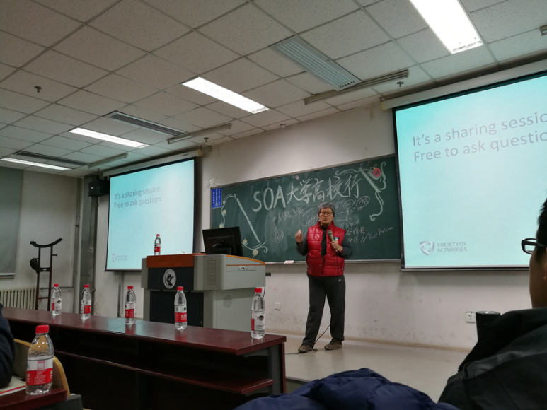 紧接着,李晶鑫女士为我们讲述了她自己接触到精算师这个行业的经历,同时为我们介绍了SOA的基本情况、未来几年新的变化以及很多相关信息。SOA可提供的网上模拟试题,SOA的官方微信、微博等等。在这个过程中,她鼓励我们多去尝试,多方位的了解信息,更好的对自己未来的职业生涯做好规划。
