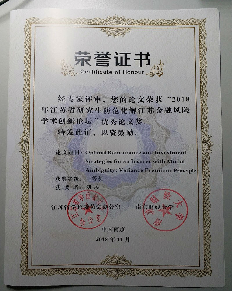 2018年11月24日,由南京财经大学主办的“2018年江苏省研究生防范化解江苏金融风险学术创新论坛”在南京财经大学举行,伟德betvlctor体育官网2016级博士研究生刘兵提交了其最新的研究成果“Optimal Reinsurance and Investment Strategies for an Insurer with Model Ambiguity:Variance Premium Principle”参加了此次论坛,并于24日下午作了优秀研究生论文报告。