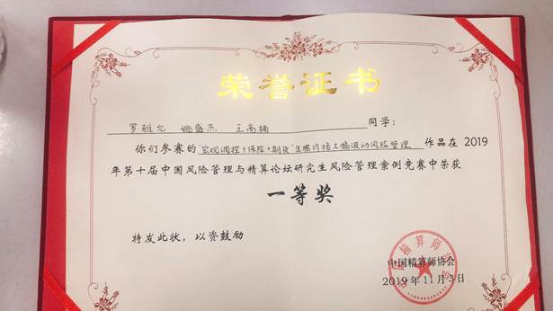研究生风险管理方案设计竞赛中,韦晓老师指导的罗雅允、姚盛杰和王高楠三位研究生的作品《“宏观调控+保险+期货”生猪价格大幅波动风险管理》获得了中国精算师协会颁发的一等奖,郑苏晋老师指导的郭海若、宋姝凝和胡海涛三位研究生的作品《微博大数据分析在风险管理的不同阶段的作用》获得了中国精算师协会颁发的二等奖。