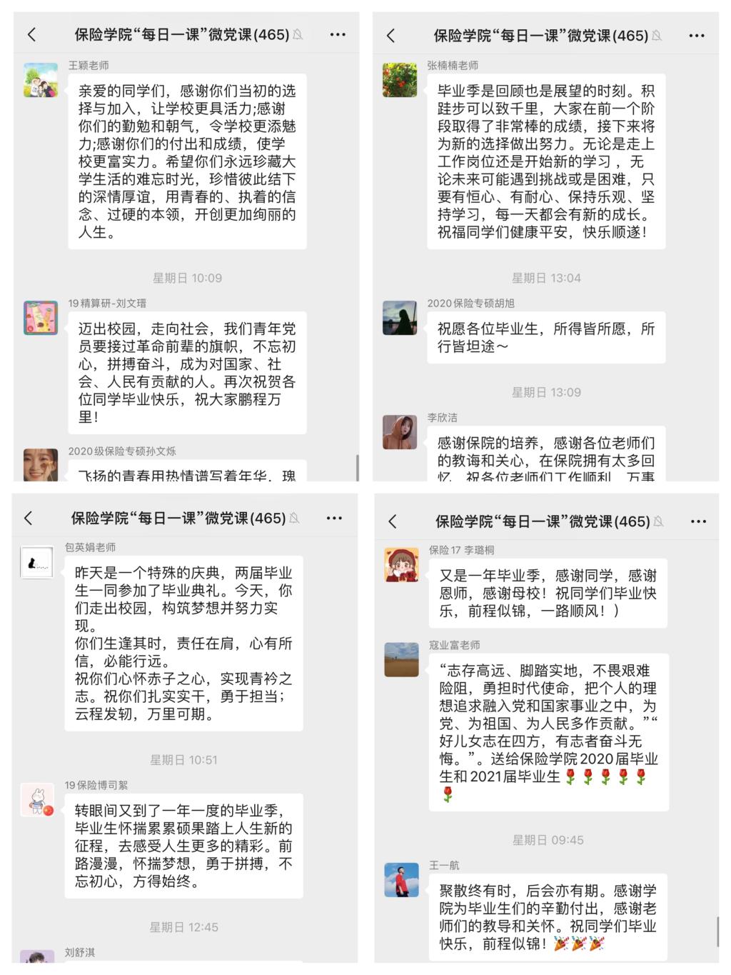 7月3日,学院在“每日一课”微党课平台开展“毕业寄语 祝福相送”活动,由学院团委书记吴蓓老师带来主题为《愿你乘风归来,愿你一路顺风——送给2021届和2020届毕业生》的寄语,她讲到,希望大家能永怀赤子之心,传承中财大“红色基因”“筚路蓝缕”“财经黄埔”三色精神,在工作中砥砺前进,在学习中勇攀高峰。师生党员纷纷互动留言,将不舍和感激付诸笔尖。