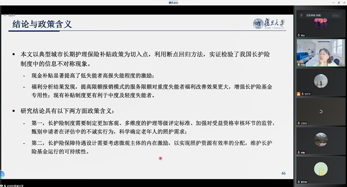 封进教授报告的题目为“社会保障补偿模式、信息不对称及政策效果——基于长期护理保险试点项目的研究”。文章研究的主要问题为社会保障补偿模式对个体是否汇报真实私人信息具有内在激励。封进教授基于我国某个地区的长期护理保险试点,首先从理论上论证了几种常见补偿模式(如实物补偿和现金补偿)对于申请者失能程度高报的激励。再利用典型城市长护险政策和实际运行数据检验了个体高报失能程度的行为。文章稳健地发现,基于特定失能等级的现金补贴有高报激励,使低失能者评为高失能者的概率显著提高7.0-10.3个百分点,异质性分析发现高报问题在初始健康状况较好的群体中更严重。在经过实证分析以后,封进教授提出了两种改进方案,文章的结论说明了完善长护险待遇保障政策的重要性。