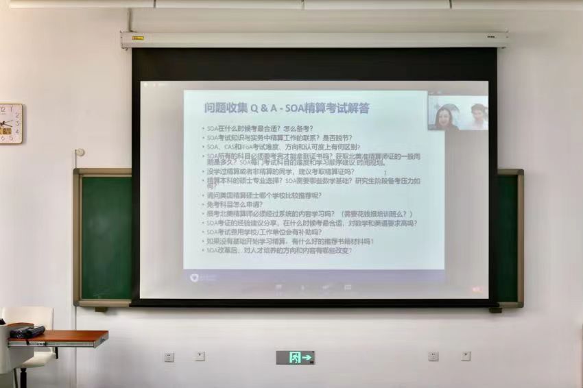 在短暂的休息后,李晶鑫女士和赵朝熠博士与同学们进行了互动问答环节。嘉宾对同学们所关心的SOA备考问题、精算就业和职业发展问题进行了详细的解答和拓展,为同学们的职业规划提供专业建议,帮助同学们规划未来发展方向。