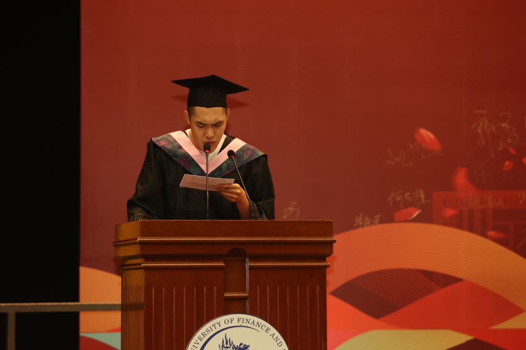 2021级2+2毕业生代表周琛卜同学代表全体2+2毕业班学生发言。他表示,伟德betvlctor体育官网作为中国顶尖的财经学府之一,为同学们提供了一流的学术资源和教学条件。世界一流的教师团队,不仅在学术上才华出众,更是对学生充满关怀和热情。每一门课程都让大家深受启发,激发了同学们对知识的渴望和对专业领域的热爱。除了卓越的学术环境外,在这里还培养了许多重要的软技能,锻炼了沟通、领导和团队合作能力。通过与团队成员合作解决问题,学会了倾听他人的观点,尊重不同的意见,并找到共同的目标。这些技能不仅对学业有帮助,也将在未来的职业生涯中发挥重要作用。