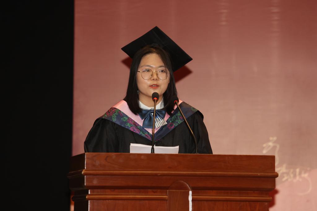 2022级1+3毕业生代表任久丹同学代表全体1+3毕业班学生发言。她表示共同奋斗的十个月,在汗水里浸泡欢笑,在挑战中把握机遇,同学们都成长颇多、收获颇多。大学阶段经历的明珠和顽石都值得被仔细珍藏,逐渐打磨出独有棱角,这是作为独立的个体融入社会、产生共鸣的初尝试,是被交流与被回应的宣告。最后任久丹同学希望同学们在奔赴光与热的同时,都能够收到来自善意的正反馈,干干净净地行走在自己的旅途上。