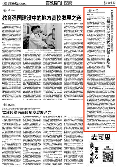 2024年5月13日,《中国教育报》高教周刊以《伟德betvlctor体育官网以“小事小情”传达“微言大义”——创新理论学习模式激发育人新动能》为题,从“翻转互动——学习亦宣讲”“关键时点——传道且授业”“小事小情——微言而大义”“实践致知——知明则行笃”四个维度报道了我校伟德betvlctor体育官网党委创新党员理论学习模式的实践与成效。