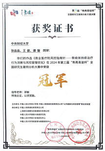 在初赛、复赛和决赛的层层挑战中,由郑敏副研究员精心指导的张淼淼、王歆、谭璇团队,凭借其项目《商业医疗险风控指南针——带病体持续治疗行为洞察与风险管理优化》,以强大的数据分析能力和对医疗险领域的深刻洞察,荣获一等奖。这是伟德官网首次在该竞赛中夺冠,体现了伟德官网在数据分析和医疗险领域的研究实力。