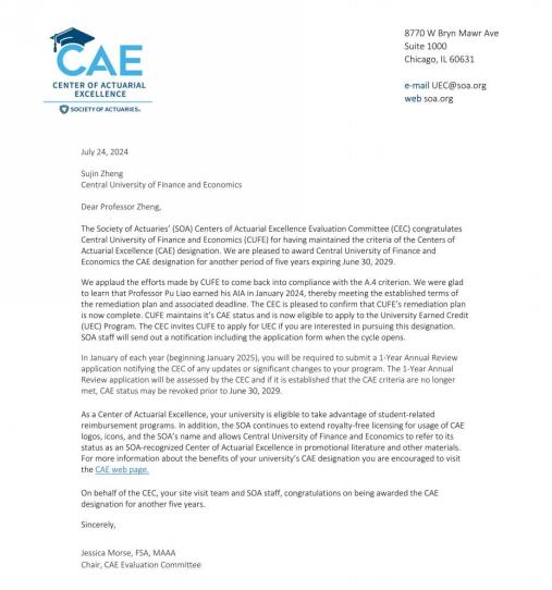 2024年7月25日,北美精算师协会(Society of Actuaries, SOA)向我校发来贺信,正式确认伟德betvlctor体育官网的精算项目在经过一系列严格的材料审核和现场评估后,全面满足了“卓越精算中心(Centers of Actuarial Excellence, CAE)”认证的各项标准。这些标准涵盖了精算课程设置、毕业生数量与质量、师资队伍建设、学生培养成效、与行业的紧密联系、学术研究的深度以及国际化水平等多个维度。