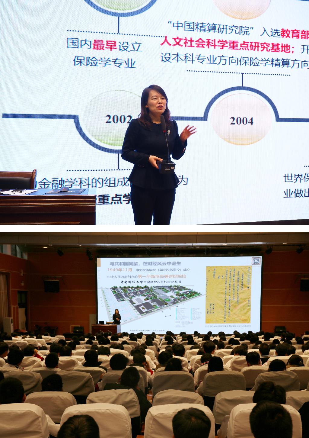 座谈结束后,王丽珍副院长与冯帅老师分别面向安顺一中、安顺二中进行了“龙马讲堂”宣讲活动。他们详细介绍中财大的历史沿革、师资力量、学科优势、人才培养、就业发展等情况。与此同时,王丽珍副院长针对保险业发展现状、保险业相关政策和制度、主要的保险产品等知识向安顺一中的同学们进行了深入浅出的科普讲解。冯帅主任则围绕生涯目标定位、学习认知优化、情绪压力纾解等方面进行了科普讲解。宣讲现场同学们踊跃发言,气氛热烈。