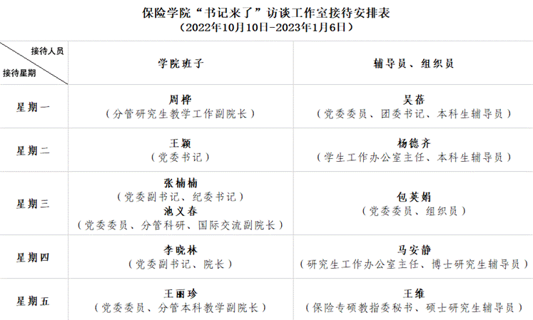 下面是“书记来了”访谈工作室2022年10月10日至2023年1月6日接待安排表,欢迎广大师生共同交流,等你来哦!