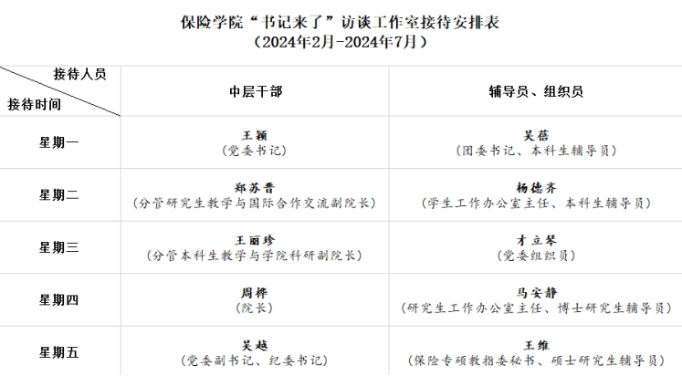 下面是“书记来了”访谈工作室2023-2024学年第二学期的接待安排表,欢迎广大师生共同交流。