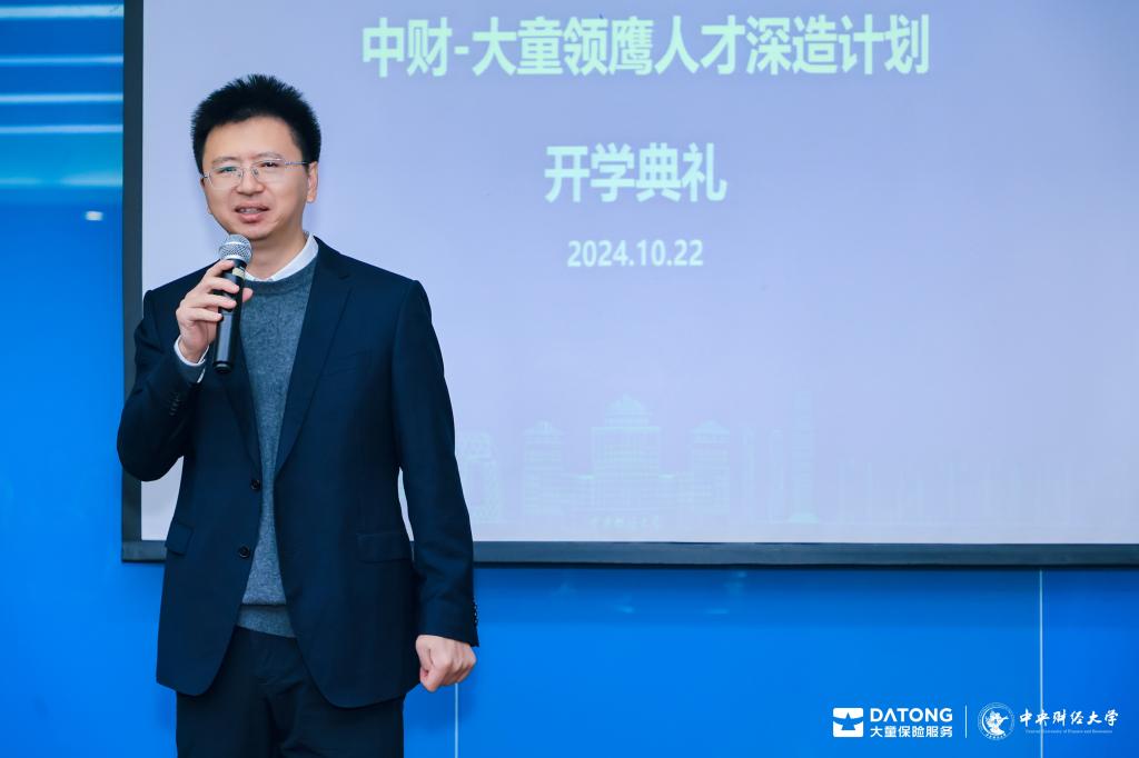 大童保险王戈副总裁介绍了中财-大童领鹰人才深造计划的背景,他表示领鹰人才深造计划不仅关注于提升员工的专业技能,鼓励员工在学习和实践中不断成长,更注重培养具有国际视野和本土实践能力的人才。他对学员们表达了殷切的期望,鼓励学员们全心投入学习,把握学习机会,为未来的职业生涯打下坚实的基础。