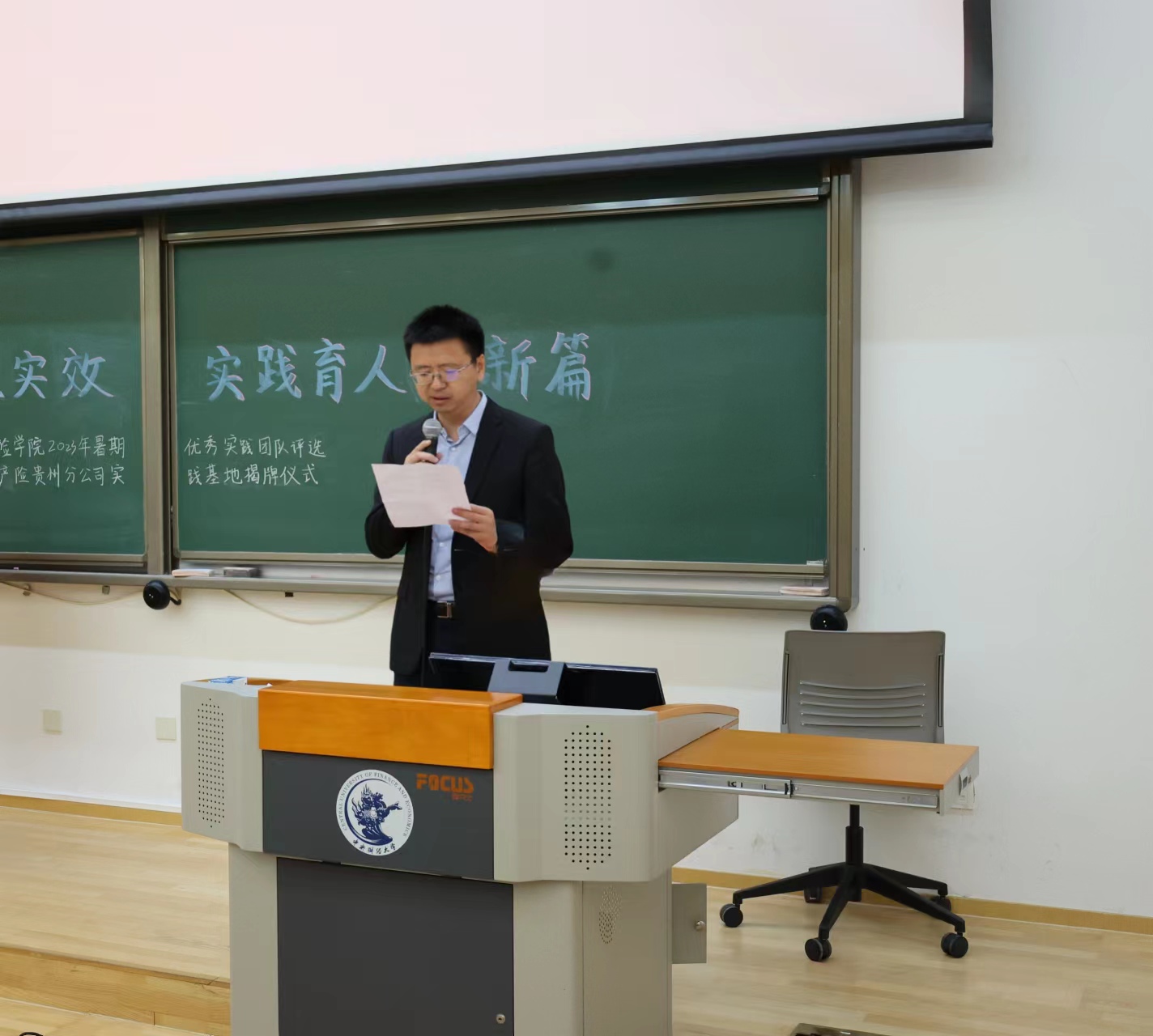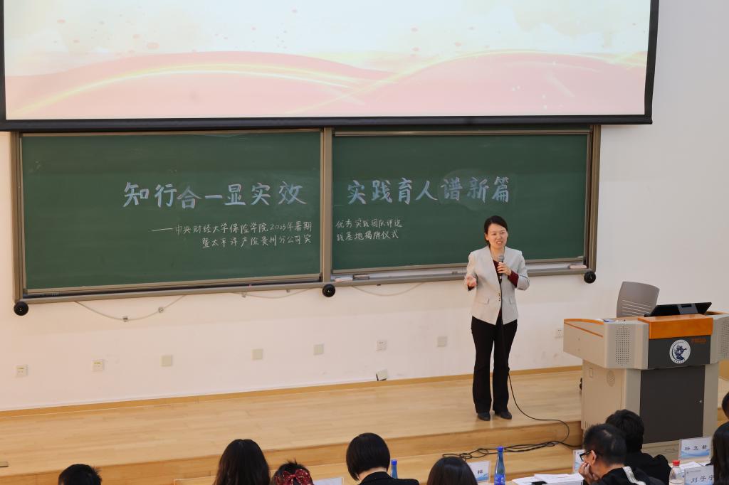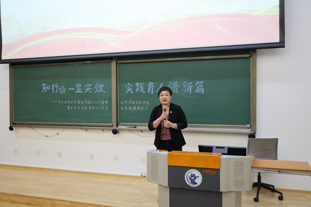 在太平洋产险贵州分公司实践基地揭牌仪式环节,太平洋产险贵州分公司人力资源部总经理杨立新致辞,他提出三点感受:第一个是敬佩,向伟德betvlctor体育官网的领导和老师们致敬,向知行合一的优秀中财大伟德betvlctor体育官网的同学们致敬。第二个是忐忑,对于多年的管理者来说,如何安排和提供学生实践学习的机会是一个崭新的课题,一定要为学生服务好。第三个是期待,期待学生们到贵州去实习,到贵州去实践,甚至到贵州去工作,让大家了解贵州、喜欢贵州。