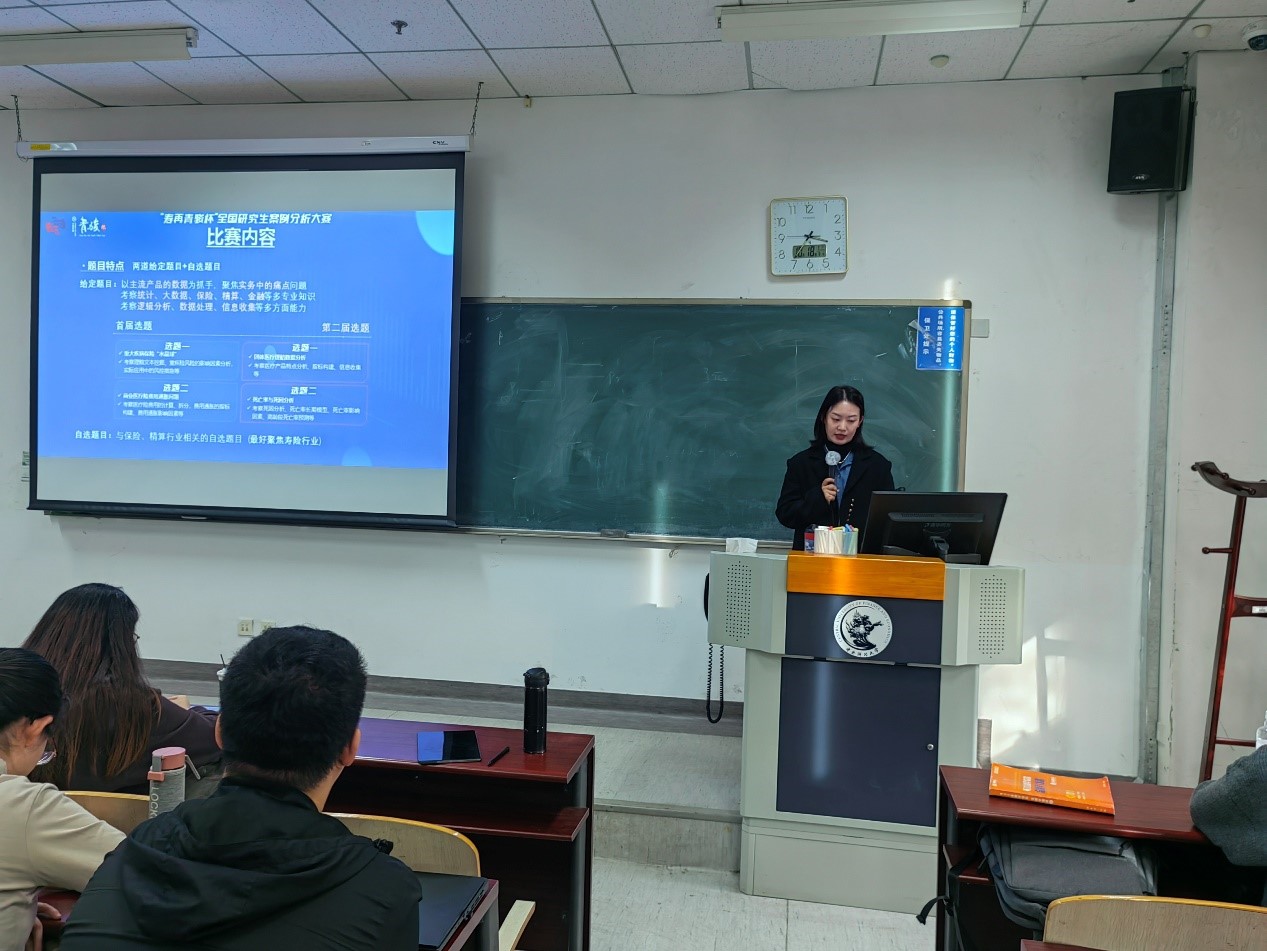 在第一环节,徐子淇女士依次为学生们介绍了“寿再青骏杯”全国研究生案例分析大赛的比赛内容、考察重点等。介绍比赛内容时,徐子淇女士为同学们解读了各个选题,并指出题目核心是要让参赛者从主流产品数据入手,最终聚焦于解决实务中的痛点问题,这需要同学们掌握相关的数理金融知识以及具有相应的分析能力。讲到考察重点时,徐子淇女士贴心地提示同学们在参赛时注意首先要有清晰的整体逻辑,不能盲目直接进行数据的处理,其次运用专业知识时要注意正确性与准确性。此外,徐子淇女士强调比赛的重点不是让参赛者完成计算题,不能仅满足结果的准确,对结果所反映的问题或实际应用进行深入说明可能是主办方更希望看到的结论。