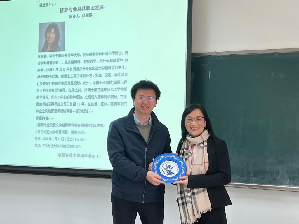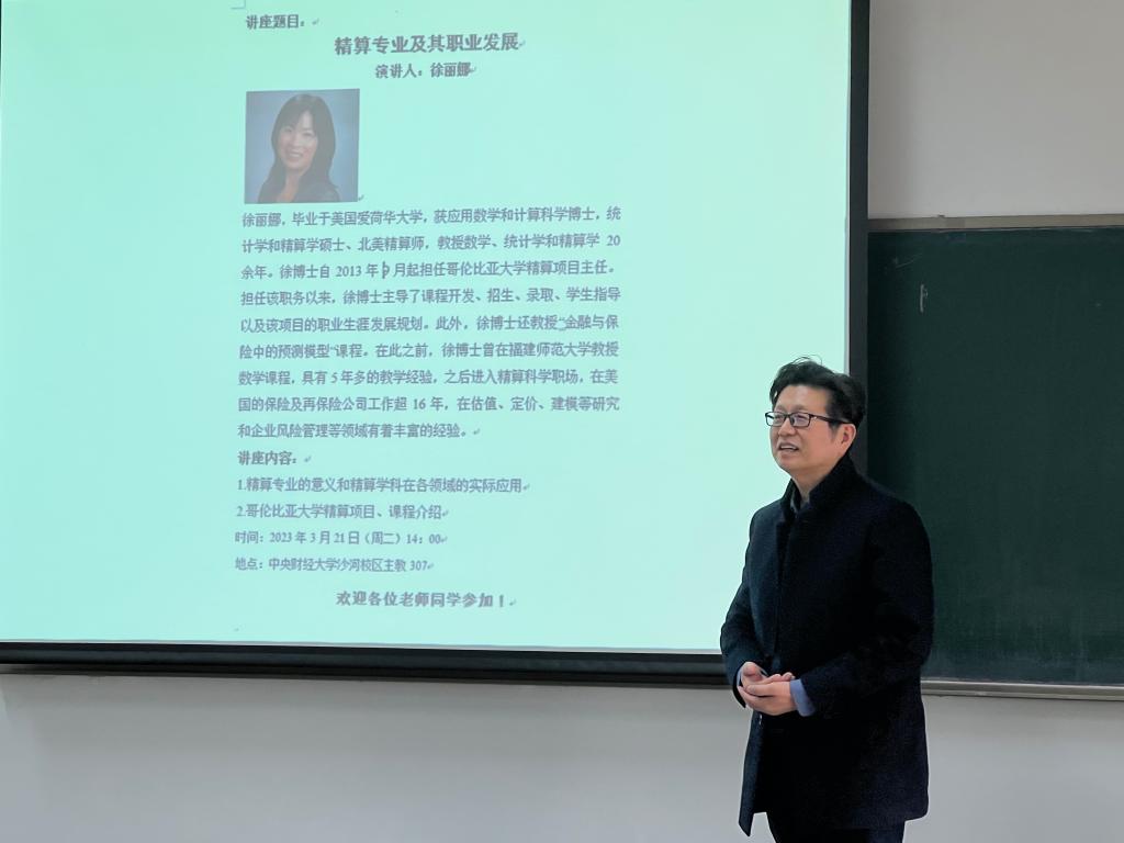 2023年3月21日,美国哥伦比亚大学精算项目主任徐丽娜女士受邀前来伟德betvlctor体育官网,为伟德官网师生带来一场题为《精算专业及其职业发展》的专题讲座。本次讲座由伟德betvlctor体育官网精算科学系主任郑苏晋教授主持;李晓林教授到会,并介绍了徐丽娜女士对中财精算项目工作支持的情况;学院院长周桦教授向徐丽娜女士表达了诚挚感谢,并赠送了学院纪念品。