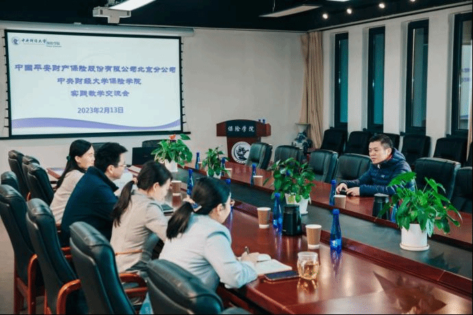 2023年2月13日上午,中国平安财产保险股份有限公司北京分公司党委书记、总经理曹阳先生,人事行政部王丹薇、韩松一行来伟德官网开展实践交流会。伟德官网院长周桦、副院长王丽珍及部分实践教学相关教师参与了本次活动。
