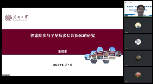 第二位演讲人是南开大学保险系朱铭来教授,他分享了题为“普惠险参与罕见病多层次保障的研究”的演讲。朱教授首先介绍了罕见病的基本医疗保障现状以及我国罕见病用药保障政策及实践。商业普惠险保障罕见病的模式主要分为目录内保障、特药保障、目录外保障和其他保障。朱教授以“戈谢病”为例分析了罕见病的普惠险产品定价流程,并总结了完善罕见病多层次医疗保障的建议,如优先保障普惠险项目运营的稳定性、妥善应对医保待遇清单统一和优化罕见病的保障责任等。