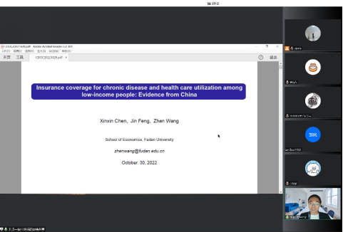 第七位汇报论文的学者是来自复旦大学经济学院的王贞老师,他汇报的题目是“Insurance coverage for chronic disease and health care utilization among low-income people: Evidence from China”,该研究关注了低收入群体的健康保险覆盖和医疗服务使用的问题。汇报结束后,来自瑞士圣加仑大学的邹岚博士进行了点评并且就相关问题和王贞老师进行了交流。