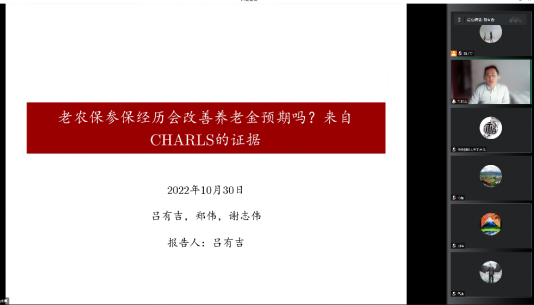 第五位汇报论文的学者是来自南开大学金融学院的吕有吉老师,他汇报的题目是“老农保参保经历会改善养老金预期吗?来自CHARLS的证据”,该研究关注了老农保经历对于个人养老金预期的影响。汇报结束后,来自北京大学现代农学院的吴派欧博士进行了点评并且就相关问题和吕有吉老师进行了交流。