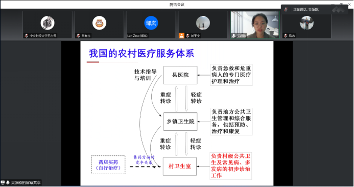 第六位汇报论文的学者是来自北京大学现代农学院的吴派欧博士,她汇报的题目是“村卫生室实施基本药物制度对农村患者医疗服务利用的影响”,该研究关注了村卫生室基本药物制度都对于农村患者医疗服务利用的影响。汇报结束后,吕有吉老师进行了点评并且就相关问题和吴派欧博士进行了交流。