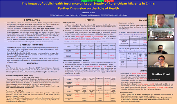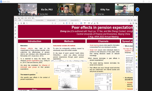 北京时间8月3日上午,助理教授刘子宁在poster session分会场上报告了其与南开大学吕有吉、北京大学郑伟教授合作撰写的学术论文“Peer effects in pension expectations”,并与会场点评人针对论文内容进行了交流与讨论。博士生周佳璇宣讲了论文“The Impact of Medical Insurance on Labor Supply of Rural-urban Migrants: Further Discussion on the Intermediary Effect of Health”,并对点评人提出的问题作出回应。