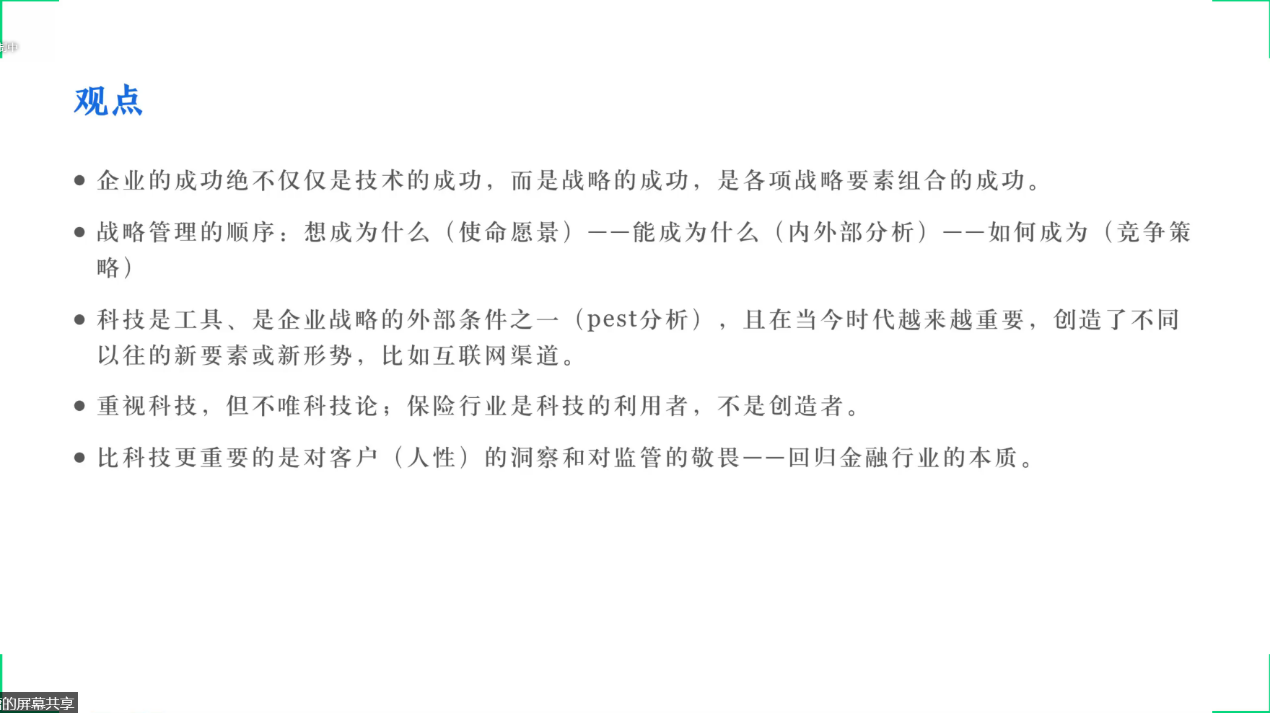 课程伊始,马潇先生介绍了我国互联网保险市场的发展情况,从险种结构到销售渠道,梳理时间脉络与关键事件,概括了互联网保险发展的四大阶段及其特征:从B2C时代以迁移为主、场景时代争夺流量、融合时代积极赋能、再到科技时代以效率为先。马潇先生点明如今科技正从销售到服务的各个环节重塑保险,全流程赋能保险业。