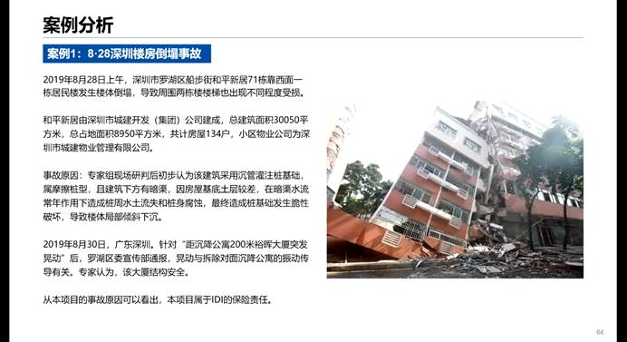 本次讲座苗女士重点讲解了工程保险相关实务知识。苗女士首先向同学们介绍了工程保险的发展历程,接着展示工程保险的行业现状和工程保险的基本内容,然后以建筑工程保险和IDI工程质量潜在缺陷保险为例讲述了工程保险实务中的具体细节。在介绍建筑工程保险时,苗女士以“智慧工地”解决方案为例,介绍其针对工程中的具体风险,以信息网络为基础、以技术创新为驱动,进行全方位的风险监控、预防和管理,实现了全周期的风险管控。苗女士表示,IDI保险在我国探索20余年,近几年发展明显提速,并逐渐受到青睐,目前已在北京、上海、江苏等十余个省市开展试点工作。接着,苗女士通过现实中具体IDI保险案例为同学们说明了这类工程保险在减灾减损方面的重要作用。