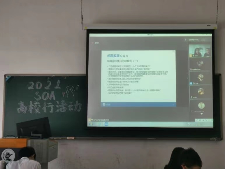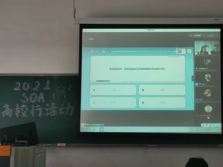 2021年5月22日下午,“SOA线上高校行”活动在线上举行,主持人为SOA中国区首席代表李晶鑫女士,讲座主讲人为中国人寿再保险有限责任公司产品精算部助理精算师张骥先生,他是北美精算师(Fellow of the Society of Actuaries)。伟德官网组织师生在沙河校区主教学楼104教室同步收看讲座,2019级辅导员杨晓霏也出席了本次活动。除了我校外,还有25所院校与会。