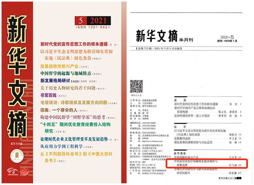 2021年第5期《新华文摘》全文转载了我校伟德betvlctor体育官网许飞琼教授发表在《中国人民大学学报》2020年第5期的论文——《中国多层次医疗保障体系建设现状与政策选择》。