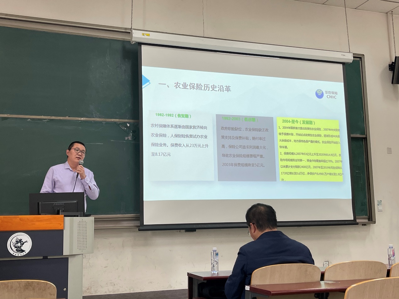 紧接着,于福宽先生从农业保险的基础理论出发,介绍了农业保险的具体分类,风险类别与特点,保险定位与作用以及相关的农业保险的政策支持,让同学们深刻了解到农业保险的业务特殊性与对于国家社会的重要性。