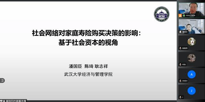潘国臣副教授在会上汇报了《社会网络对家庭寿险购买决策的影响:基于社会资本的视角》一文。该文章首次在社会资本的分析框架下研究了社会网络对家庭人寿保险购买的影响,并检验了社会网络(社会资本)作为一种非正式风险分担机制的作用。潘国臣副教授从就本文的理论分析和研究假设、计量模型构建、实证结果分析、机制分析等进行了详细的介绍和分享,并于参会者就实证方法、变量选取等方面进行了沟通交流。