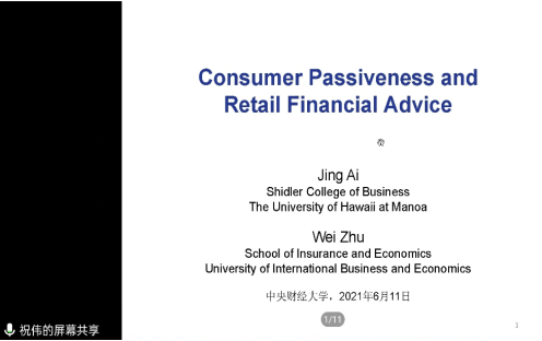 2021年6月11日,北京市双一流共建项目学术报告(暨风险管理与保险论坛(2021年度)第11讲)在腾讯会议顺利举行。本次会议邀请到对外经济贸易大学伟德betvlctor体育官网祝伟教授,就金融顾问与保险消费的关系问题作题为《Consumer Passiveness and Retail Financial Advice》的学术报告。报告由伟德betvlctor体育官网副院长周桦教授主持,伟德betvlctor体育官网和北京工商大学多位师生参加了讲座。