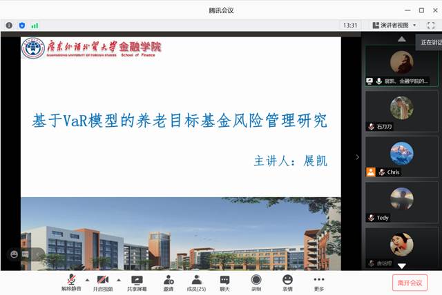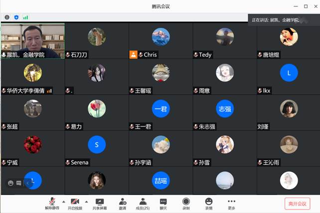 2020年11月26日,广东外语外贸大学金融学院副院长展凯教授受邀为伟德官网师生带来一场题为“基于VaR模型的养老目标基金风险管理绩效研究”的线上学术讲座,报告由伟德官网陈华副教授主持。