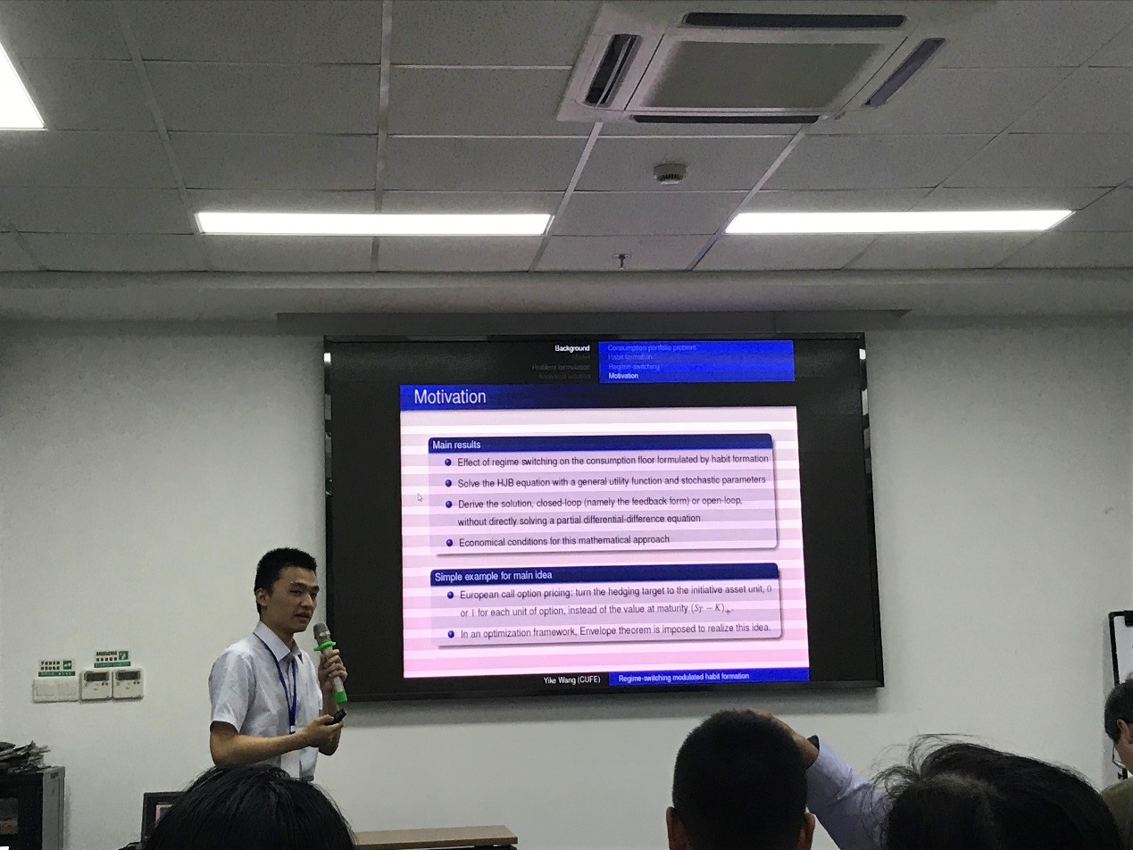 8月29日-8月30日,由中国运筹学会金融工程与金融风险管理分会主办,上海财经大学承办,复旦大学协办的“中国运筹学会金融工程与金融风险管理分会第九届学术年会”在上海召开。伟德官网2017级精算学硕士生王奕可应邀参加本次会议,在青年学者最佳论文奖(竞选)专题会场报告了其与导师、香港理工大学Ka-Fai Cedric Yiu教授和澳大利亚Macquarie大学Tak Kuen Siu教授合作的题为《Optimal consumption-portfolio decision with habit formation in a Markovian regime-switching jump-diffusion model》一文。该报告主要讨论了随宏观环境系统性变化的消费习惯,以及相应的个体效用最大化模型,借助随机场和微分同胚等概念绕过求解偏微分-差分方程得到最优策略,引起了参会学者的兴趣和热烈讨论。