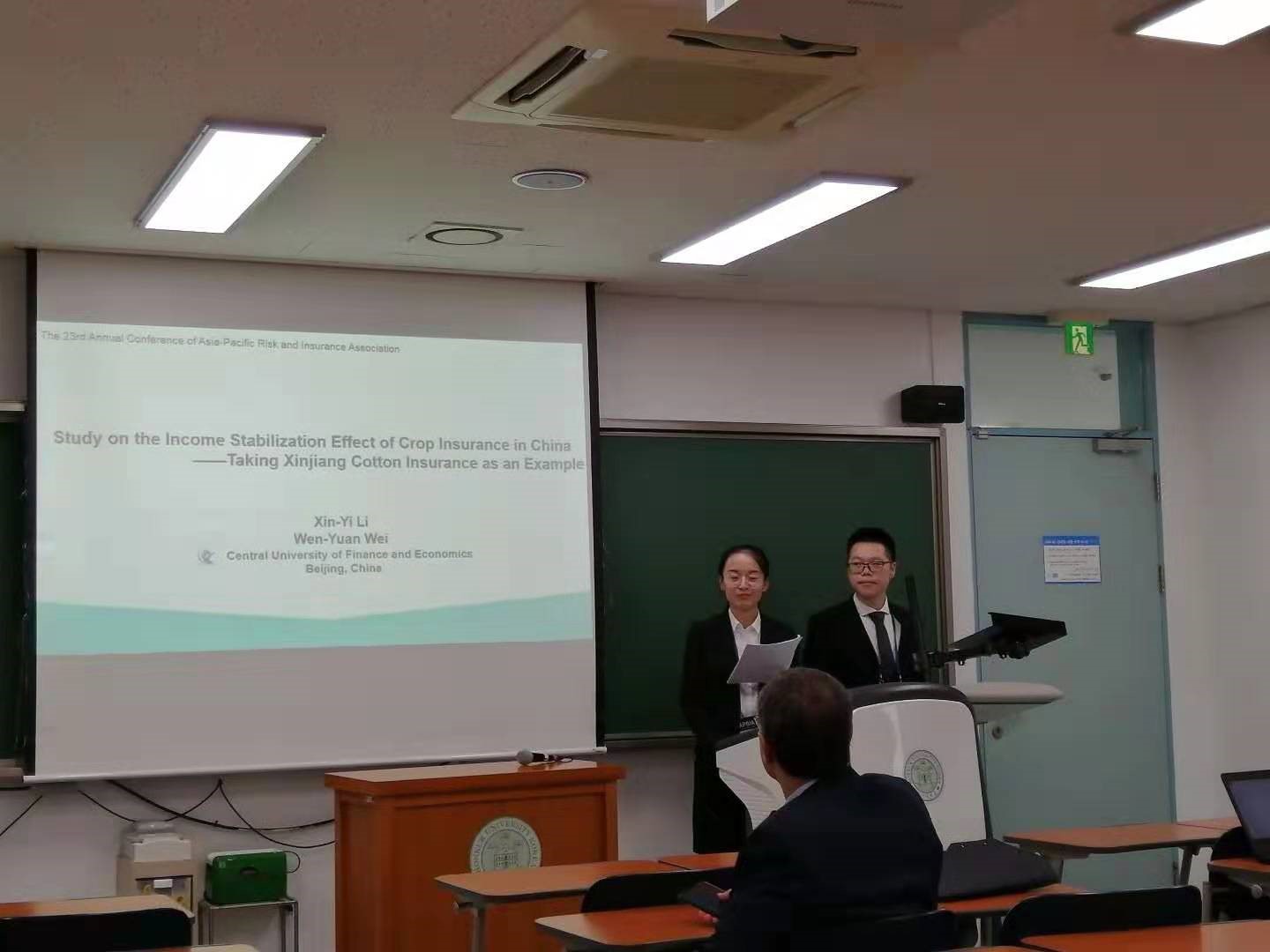 7月30日下午,2016级保险本科生李心怡与魏文渊在非寿险学术分论坛上以“Study on the Income Stabilization Effect of Crop Insurance in China——Taking Xinjiang Cotton Insurance as an Example”为题进行发言。李心怡与魏文渊从稳定收入角度分析了我国目前实施的农险的作用,并通过模拟计算衡量农险收入稳定效应,比较了成本保险与价格保险两类农险产品的收入稳定效应大小。
