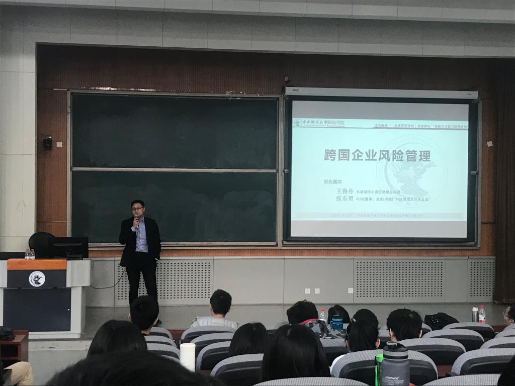 紧接着,张东贺先生为同学们做了有关企业风险管理的演讲。张先生从风险与机遇谈起,他提醒同学风险管理目标是为了更好把握机遇,而不应简单的放弃机遇来躲避风险。张先生通过对中国乃至世界范围内企业风险管理标准的梳理,指出全球各国关于披露企业重大风险的相关法律与要求日益趋严,并进一步分享了产融结合背景他对风险管理发展路径的分析。最后张先生分享了两个跨国企业风险管理案例,一针见血地指明动态风险管理将颠覆传统静态风险并成为未来发展的趋势。