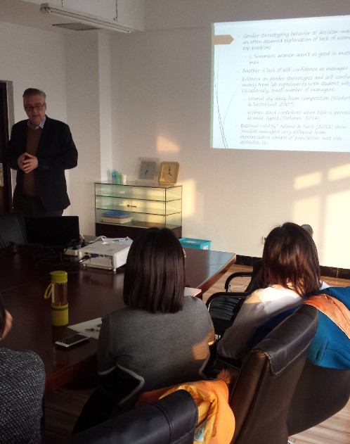 在讲座中,Tor Eriksson教授以详实数据描绘了全球性的老龄化现象,分析了老龄化现象对社会保障制度、劳动人口供给以及养老服务等多方面的影响,并指出了针对老龄化现象的困境的可能解决方案。在学术研讨会中,Tor Eriksson教授通过问卷调查的方式收集了公司管理层雇员不同性别特征和管理者特征的数据,并建立相应指数分析不同管理层级男性和女性管理者存在的性别成见(gender stereotype)。讲座和研讨会中,师生通过和Tor Eriksson教授的交流,对相关问题和研究方法有了更深入的认识。