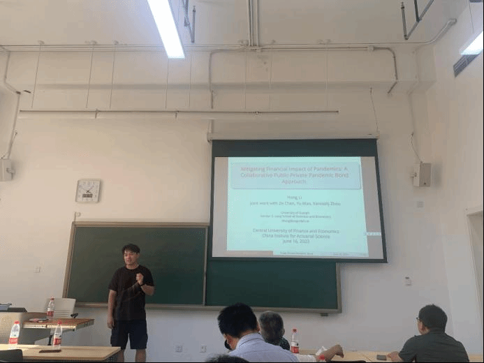随后,李泓教授为大家带来了题为“Mitigating Financial Impact of Pandemics: A Collaborative Public-Private Pandemic Bond Approach”的学术报告。李老师介绍了一种新型流行病债券,旨在减轻流行病对人寿保险公司和其他易受流行病风险影响的机构的经济影响,提出了一个新的随机易感-感染-康复-死亡(SIRD)模型来估计流行病传播过程,并将其应用于美国Covid-19数据,模拟未来的流行病场景。数值分析结果表明,随机SIRD模型能较好估计死亡率,而且提出的新型流行病债券是管理流行病对寿险公司造成的财务后果的有效工具。