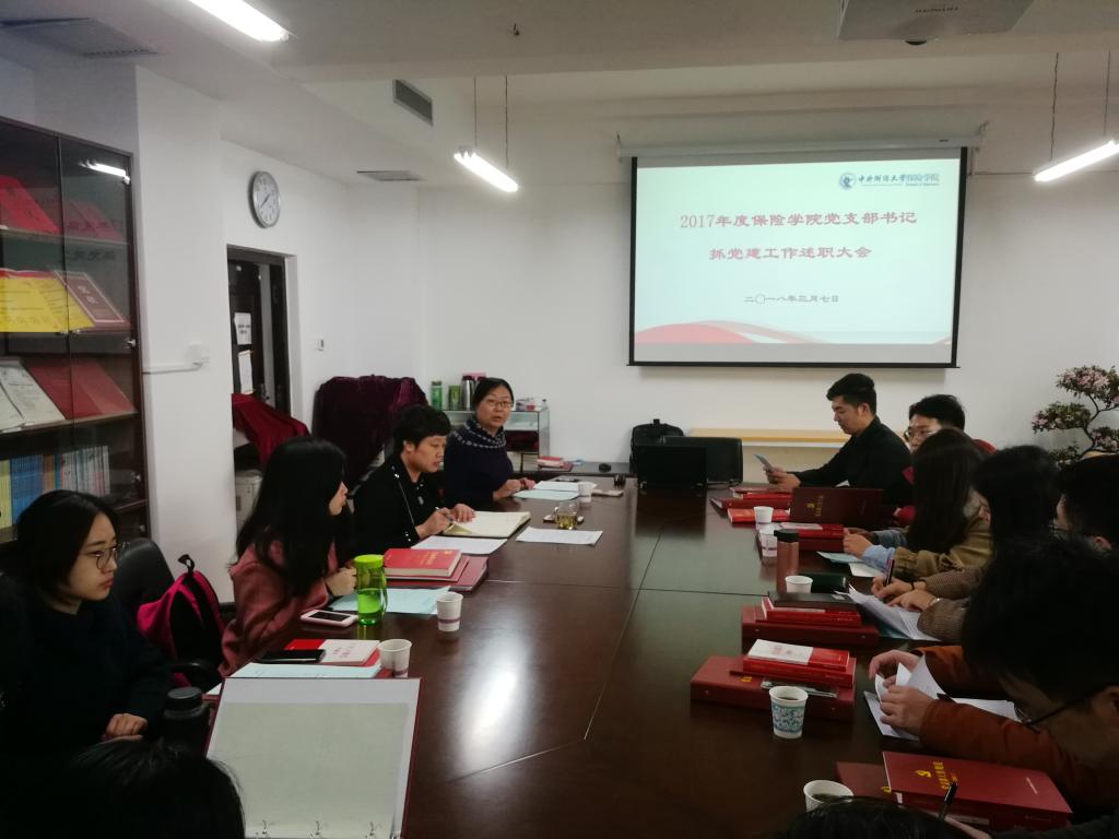 会上,党委书记王颖从专项工作、思想建设、组织建设、制度建设和党风廉政建设五个方面总结了2017年学院党建工作。在专项工作方面,学院学习贯彻党的十九大精神,组织师生党员收看十九大直播并收集反响。组织全体教师参观“砥砺奋进的五年”大型展览,聆听十九大精神专题报告,成立“伟德betvlctor体育官网十九大精神宣讲团”,开展“学习十九大·每日一课”微党课活动,宣讲100讲,党员互动1700余人次。学院圆满完成了《基本标准》入校检查的各项工作任务,系统梳理了学院5年的党建和思想政治工作,达到了以评促建的目的。在思想建设方面,学院从学院党委、党支部、教工党员和全体党员四个层面开展了分层次、分类别、有重点的学习教育。在组织建设方面。学院进一步完善了组织建设,加强党支部自身建设并抓好党员的日常学习教育。在2017年的党建评优中学院获得了学校先进党委称号、“主讲主问制”理论学习模式获得学校党建特色和创新项目、2016级保险、社保、精算研究生联合党支部获得先进党支部、本科毕业生曹宇党员获得优秀共产党员称号。在制度建设方面,制定和修订党建和思想政治工作制度70项,并编辑成册。在党风廉政建设方面,落实好党委的主体责任,督促纪委履行好监督责任。严格落实各项工作制度,全年召开党政联席会议17次,党委会议7次。严格执行财务纪律,用好党建工作三项经费。