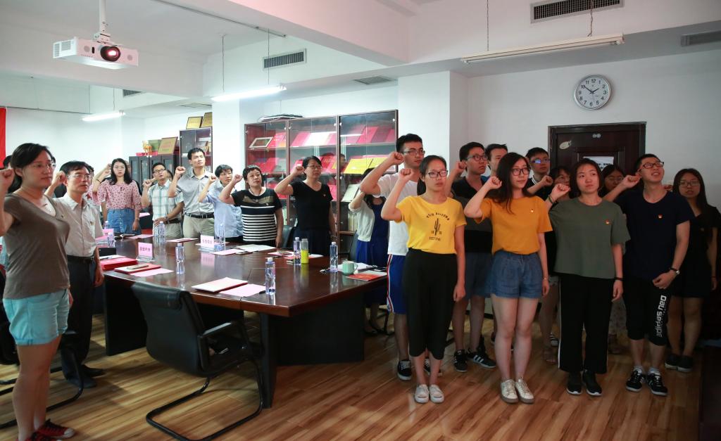 庄严肃穆的《国际歌》声中,预备党员入党宣誓、老党员重温入党誓词。2015、2016、2017级本科生联合党支部陈斯荷代表新党员向党表决心,一是要坚定信念,牢固树立正确的世界观、人生观和价值观,二是努力学习,积极进取,三是创先争优,充分发挥党员的先锋模范作用。