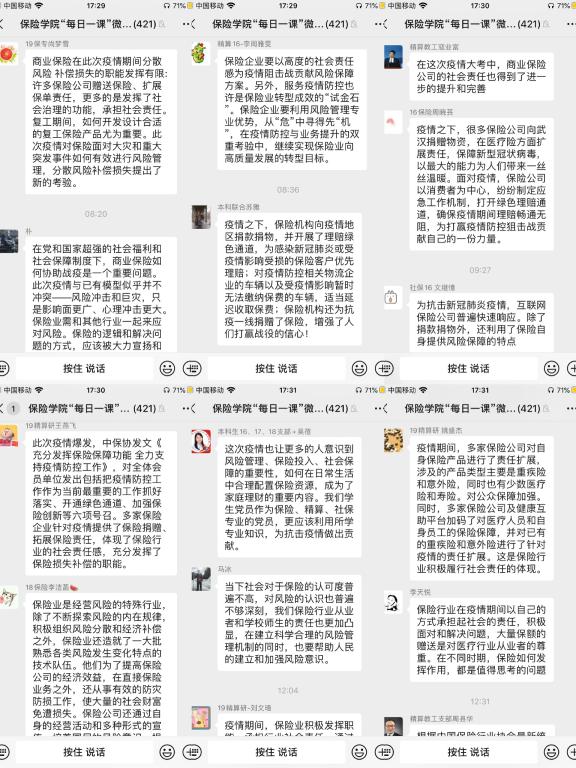 针对当下的保险行业,有师生党员提到,疫情期间,多家保险公司对自身保险产品进行了责任扩展,涉及的产品类型主要是重疾险和意外险,同时也有少数医疗险和寿险。同时,多家保险公司及健康互助平台加码了对医疗人员和自身员工的保险保障,并对已有的重疾险和意外险进行了针对疫情的责任扩展,这都是保险行业积极履行社会责任的体现。但也有党员认为商业保险在此次疫情期间分散风险、补偿损失的职能发挥有限,面对逐步开展的复工,如何开发设计合适的复工保险产品尤为重要。这些都为教师的教学和科研工作提供了新的研究领域。
