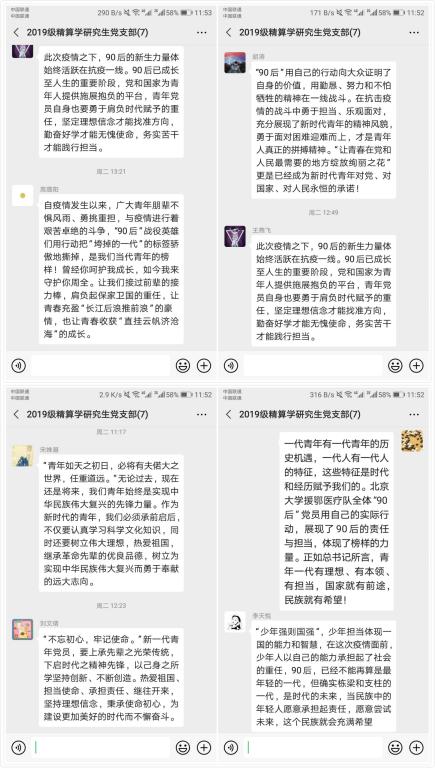 3月15日,习近平总书记给北京大学援鄂医疗队全体“90后”党员回信,向他们和奋斗在疫情防控各条战线上的广大青年致以诚挚的问候。3月27日,教育系统首场学习贯彻习近平总书记重要回信精神联学会在北京大学召开,教育部部长陈宝生就学习习近平总书记重要回信提出了具体要求。为深入学习习近平总书记给北京大学援鄂医疗队“90后”党员重要回信精神,4月1日,伟德betvlctor体育官网2019级精算学研究生党支部线上开展“学回信精神,做先锋党员”主题党日活动,支部全体党员学习了相关材料并发表学习感悟。