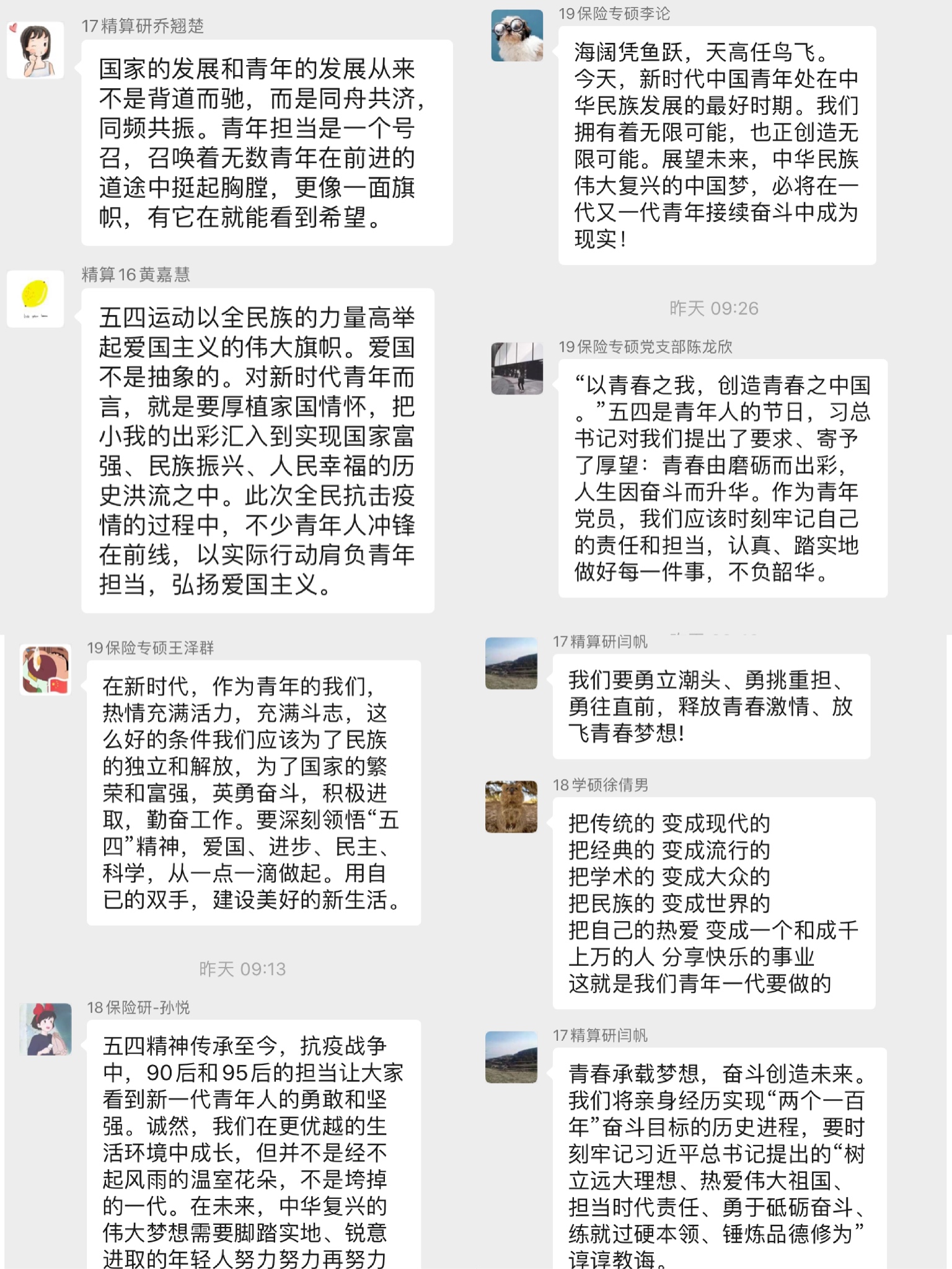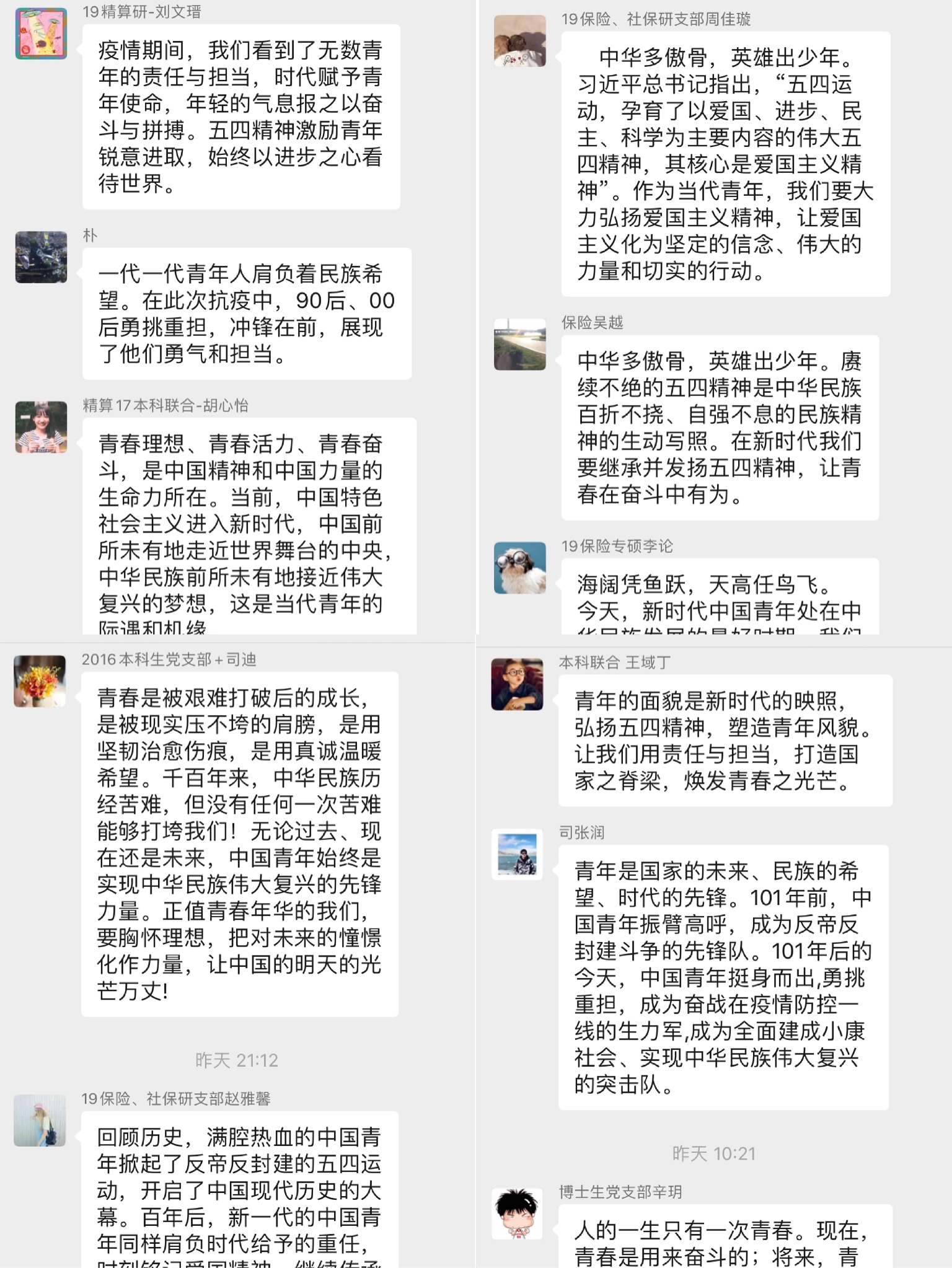 2018级保险专硕党支部孙悦提到,“五四精神”传承至今,在抗疫战争中,90后和95后的担当让全国人民看到新一代青年人的勇敢和坚强。诚然,我们在更优越的生活环境中成长,但并不是经不起风雨的温室花朵,相反,我们更应坚定理想信念,厚植爱国情怀,让青春的枝头绽放绚丽之花。
