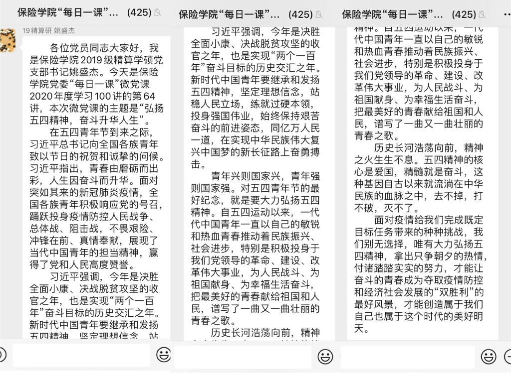 伟德betvlctor体育官网2019级精算学硕党支部书记姚盛杰在5月4日当天“每日一课”微党课的宣讲中提到:面对新冠疫情的种种挑战,我们别无选择,唯有大力弘扬“五四精神”,拿出只争朝夕的热情,付诸踏踏实实的努力,才能让奋斗的青春成为夺取疫情防控和经济社会发展的“双胜利”的最好风景,才能创造属于我们自己也属于这个时代的美好明天。