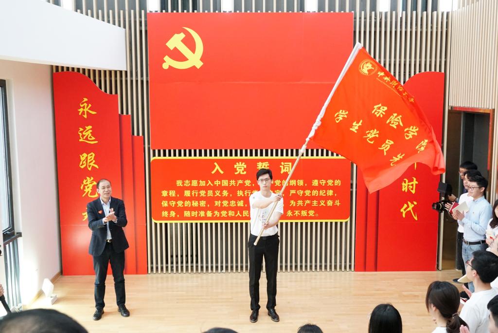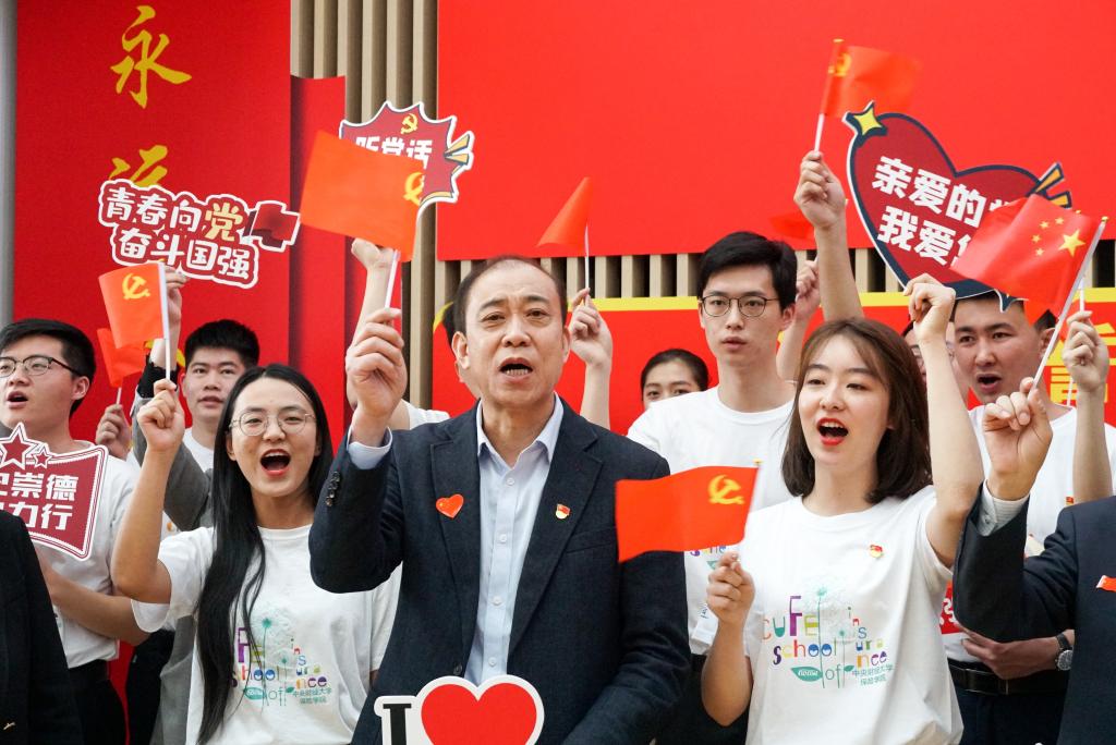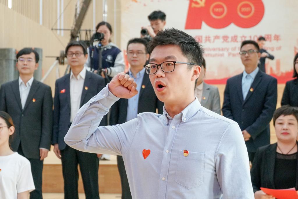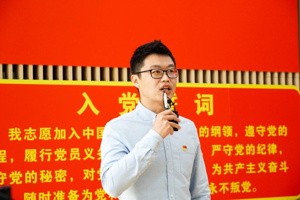 面对庄严的党旗,新党员代表青年教师马冰领誓,新党员们面向党旗举起右拳,郑重宣誓。铮铮誓言,响亮有力,字字千钧,宣告着每位党员即将担负起一生的光荣使命,也鼓舞着在场所有青年学子。