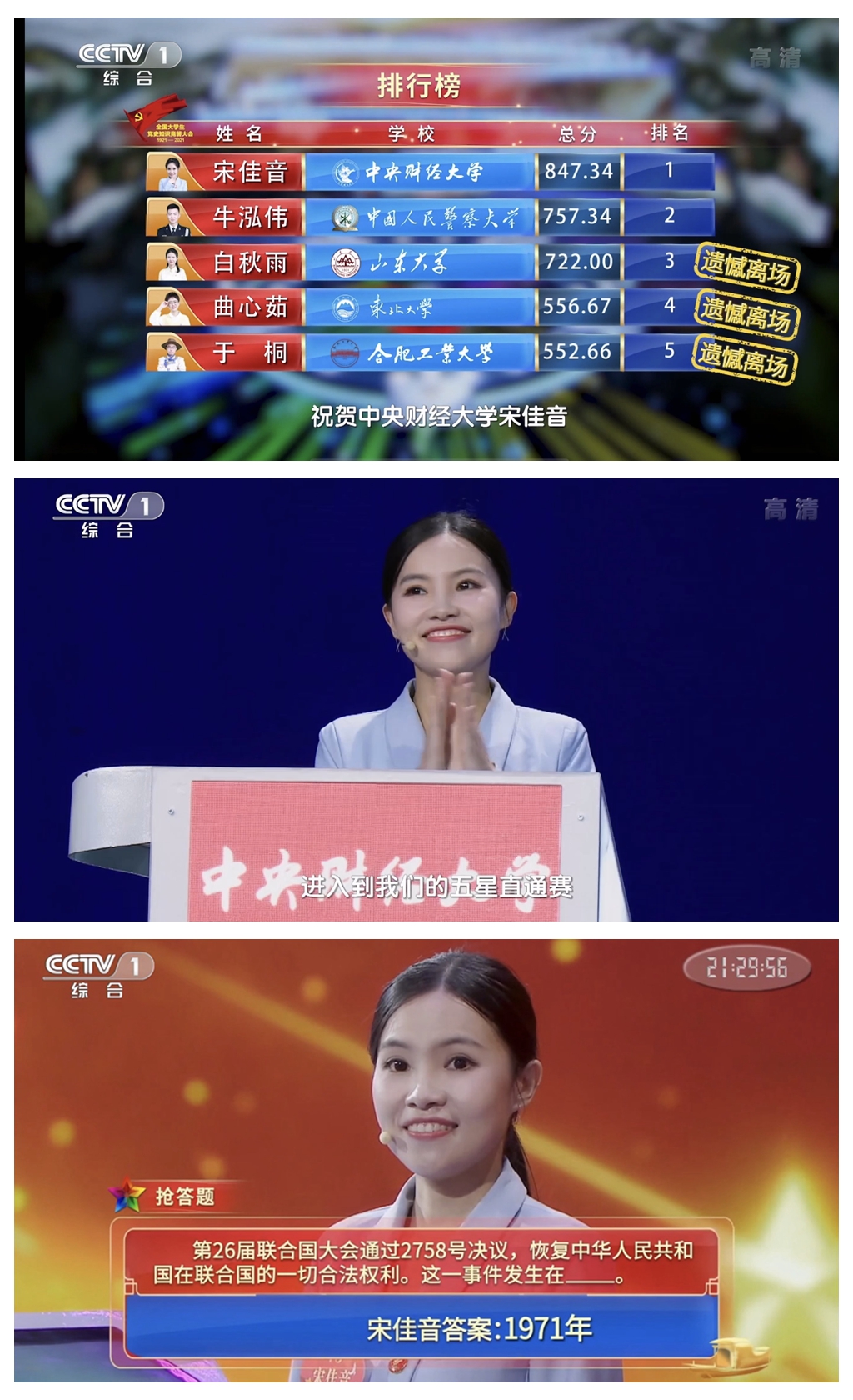 伟德betvlctor体育官网2019级保险专硕研究生宋佳音登上CCTV-1,代表伟德betvlctor体育官网出战,与全国100所高校的100名在校大学生,参与现场竞答,在紧张激烈、环环相扣的比拼中,学习党史,经受理想信念的深刻洗礼。在第五期节目“五星抢位赛”中,宋佳音凭借优异表现成功冲出“百人团”,顺利登上节目主舞台,并最终进入到了“五星直通赛”环节。