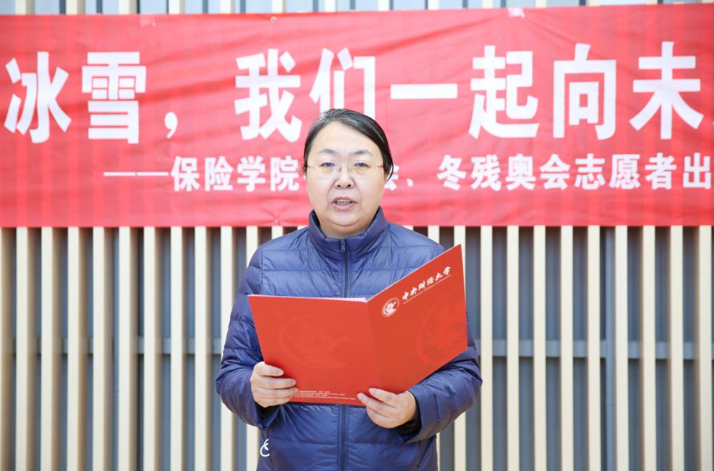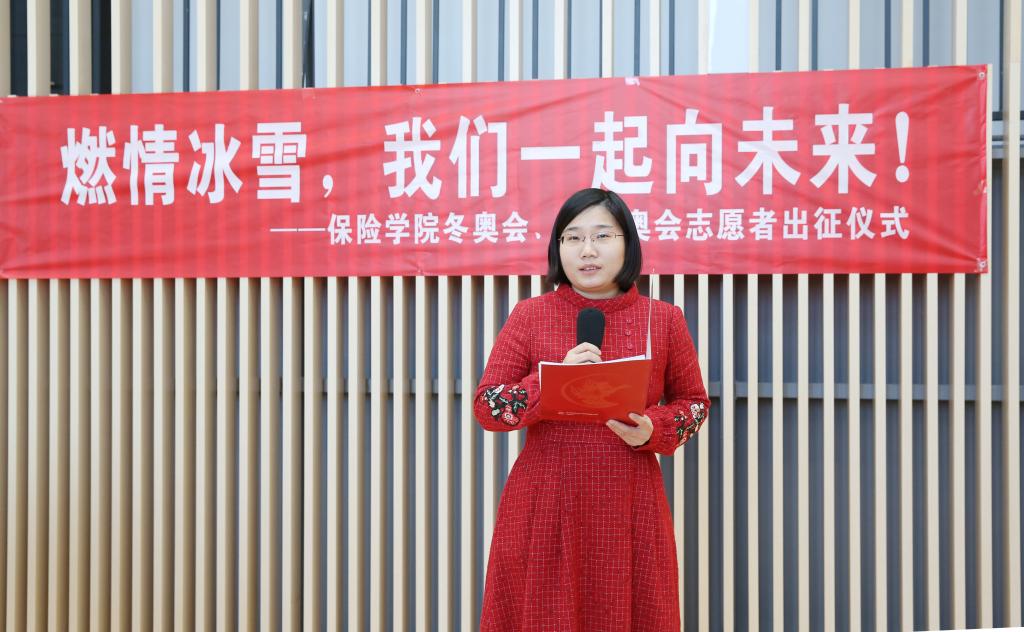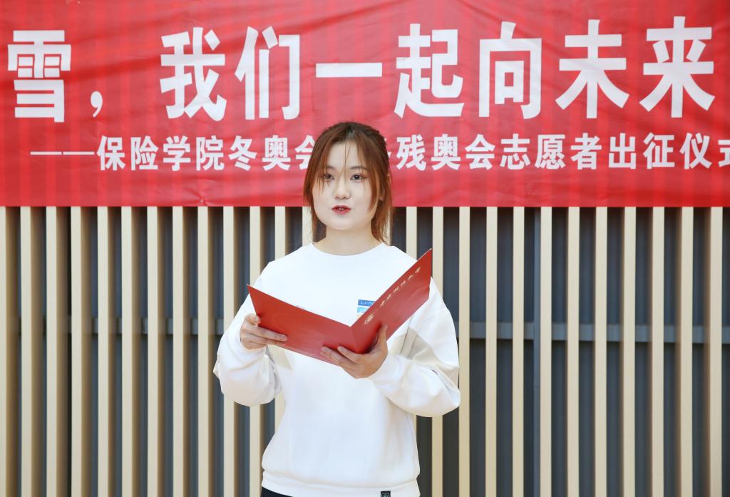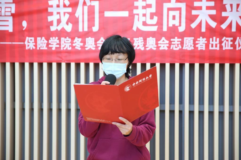 学院党委副书记张楠楠老师宣读《致伟德betvlctor体育官网冬奥会、冬残奥会志愿者的一封信》,代表学院再一次祝贺同学们通过层层选拔,成为光荣的北京2022冬奥会、冬残奥会志愿者。每一位即将出征的志愿者都是伟德betvlctor体育官网的骄傲,更是中财大的荣光,她期待同学们为精彩、非凡、卓越的奥运盛会奉献青春力量,展现中财大学子青春形象。